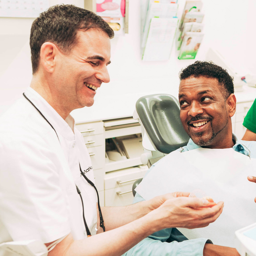 Zunächst prüfen wir, ob bei Ihnen eine Zahnkorrektur mit Alignern möglich ist. In komplizierten Fällen vermitteln wir Sie gerne an einen Kieferorthopäden aus unserem Partnernetzwerk. Lässt sich Ihr Wunsch nach geraden Zähnen mit der unsichtbaren Zahnschiene erfüllen? Prima, dann starten wir gemeinsam in die Behandlungsphase.