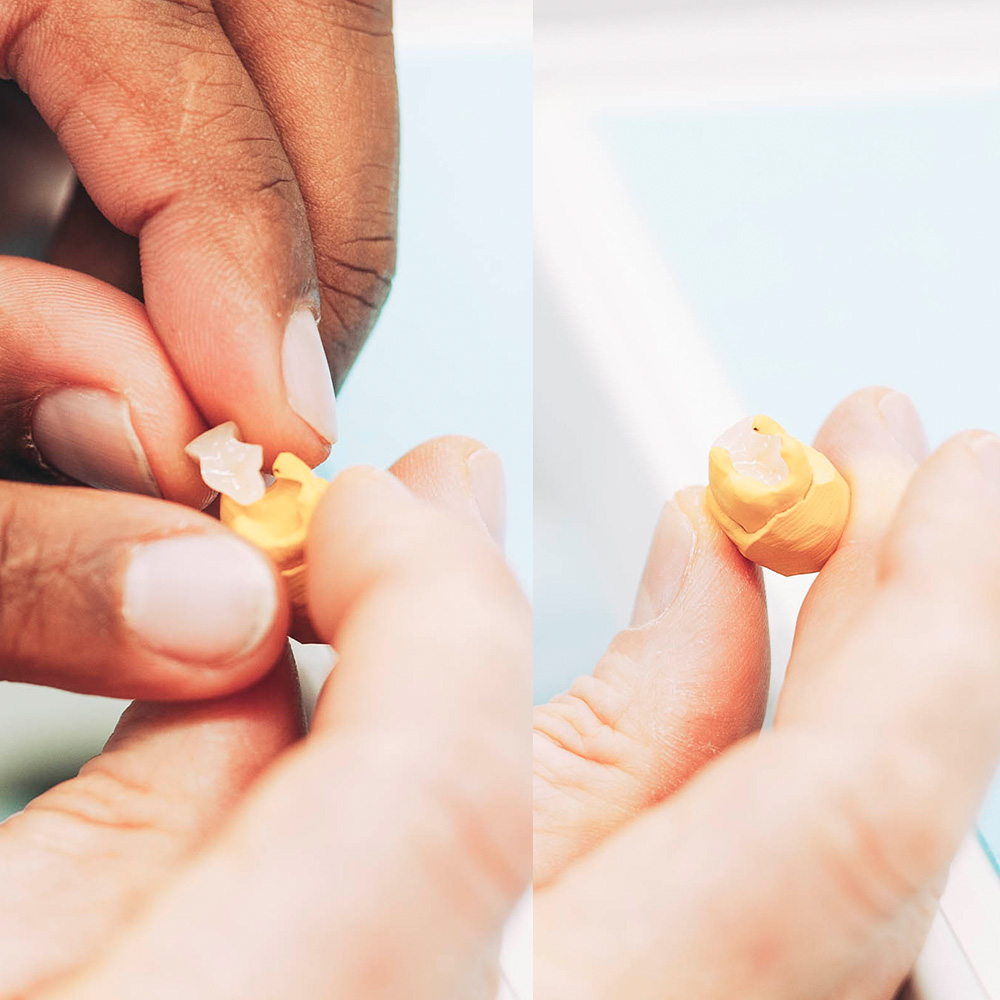 Ästhetische Teil- und Vollkronen aus Keramik setzen wir vor allem im sichtbaren Frontzahnbereich ein. Das Material ist lichtdurchlässig und sieht aus wie der natürliche Zahnschmelz.